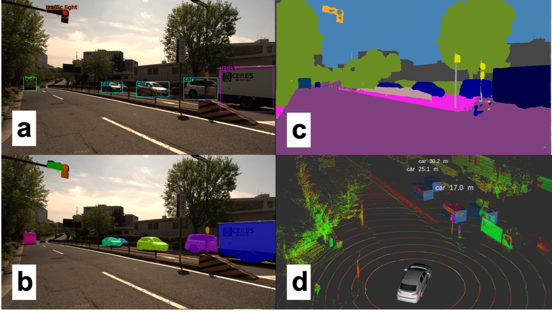 나고야 대학교 근처의 도시 풍경, 우리의 실험 차량이 촬영한 카메라 및 라이다 데이터와 최신 인식 알고리즘의 탐지 결과. (a) YOLOv3에서 생성된 경계 상자 결과를 보여주는 전면 카메라의 화각, (b) MaskRCNN에서 생성된 인스턴스 세그멘테이션 결과. (c) DeepLabv3에서 생성된 세분화 마스크. (d) 객체 탐지 결과를 가진 3D 라이다 데이터. 이 네 가지 중 3D 인식 알고리즘만이 탐지된 물체의 거리를 출력합니다.