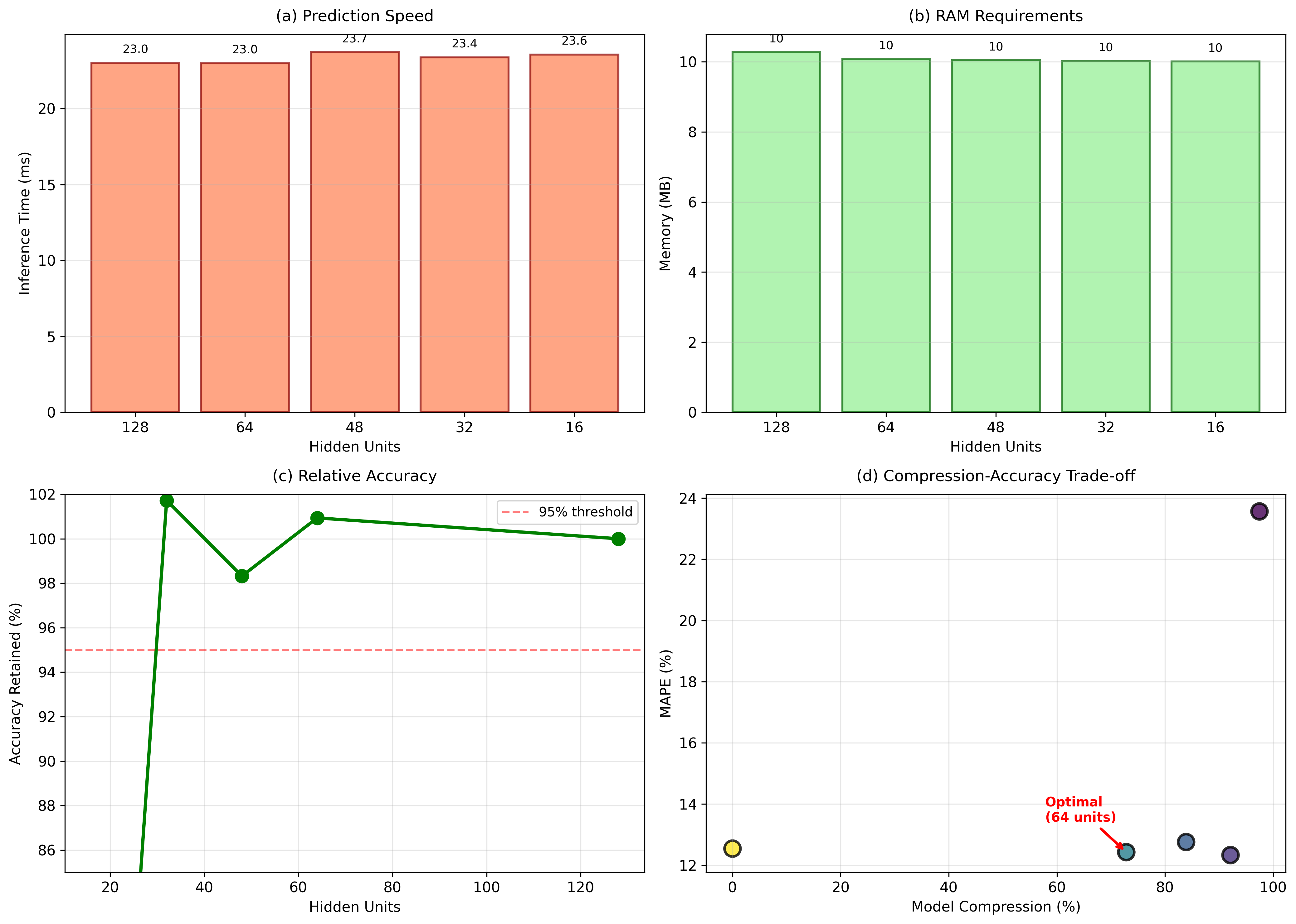 본 연구는 실제 데이터를 사용하여 LSTM 압축을 통해 소매 판매를 예측할 때 정확도를 유지하거나 향상시킬 수 있다는 것을 보여주었다. 128개에서 64개로 숨겨진 유닛의 수를 줄이는 것은 47% 더 높은 정확도와 73% 더 작은 모델을 제공한다. 이 예기치 않은 결과는 최적의 모델 용량을 찾는 것이 매개변수를 최대한 늘리는 것보다 중요하다는 것을 나타낸다. 우리의 결과는 즉각적인 실질적인 영향을 미친다: 소매업체는 정확한 예측 모델을 일반 하드웨어에서 사용할 수 있고 GPU 가속이 필요하지 않다. 가장 좋은 LSTM-64 설정은 더 높은 정확도를 제공하고 76KB의 저장 공간만 필요하므로 엣지 배포와 제약된 리소스 환경에서도 활용 가능하다. 향후 연구는 양자화와 아키텍처 최적화를 결합하여 더 큰 압축을 탐구해야 한다.