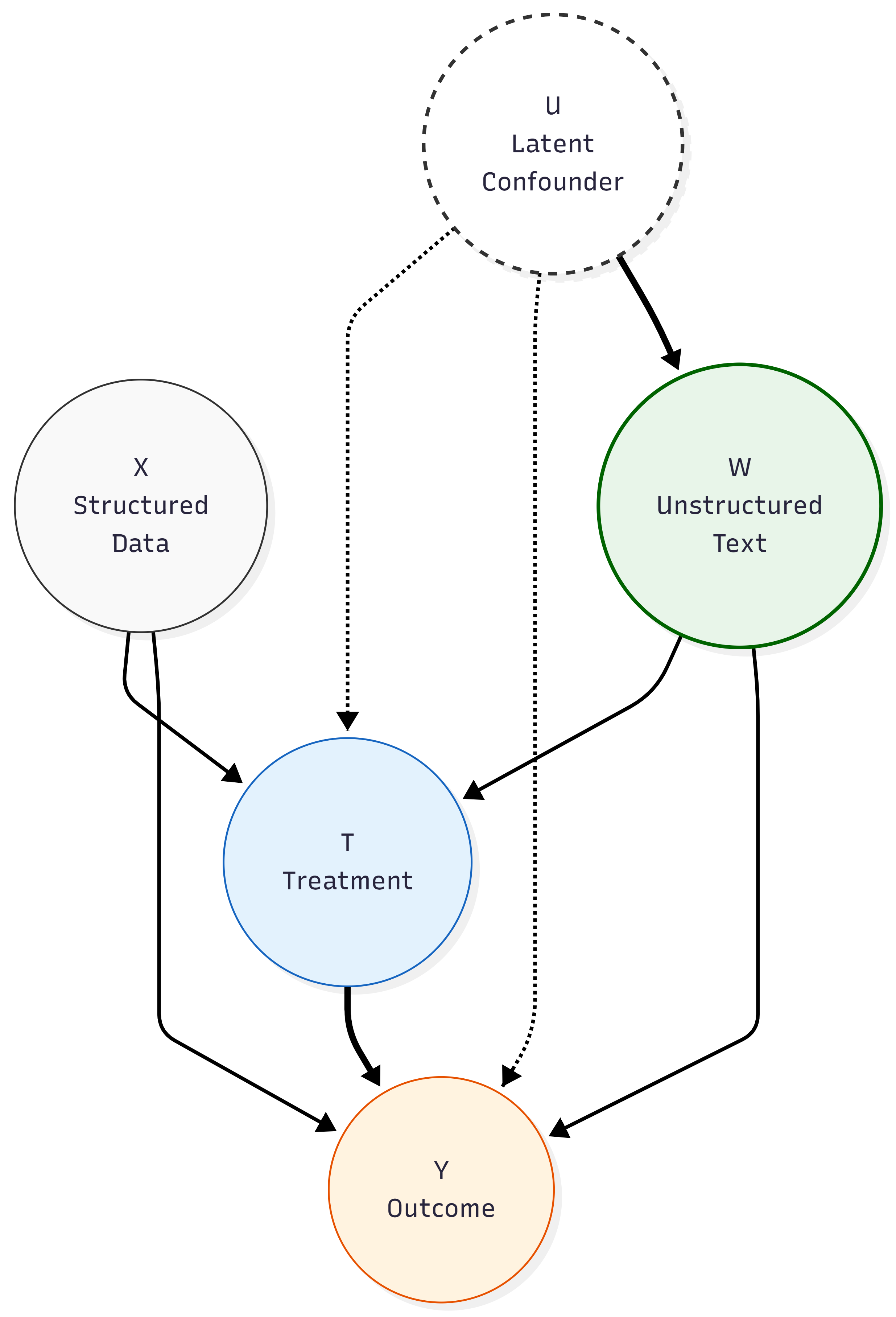 프록시 식별 전략의 유도 방향성 없는 그래프(DAG). 점선 노드 U는 구조화된 데이터 X에서 관찰되지 않는 변이성을 나타낸다. 그러나 U는 텍스트(W)를 인과적으로 영향을 미친다(실선). W에 조건화함으로써, 추정기는 U의 혼란 효과를 처리(T)와 결과(Y)에서 차단한다.