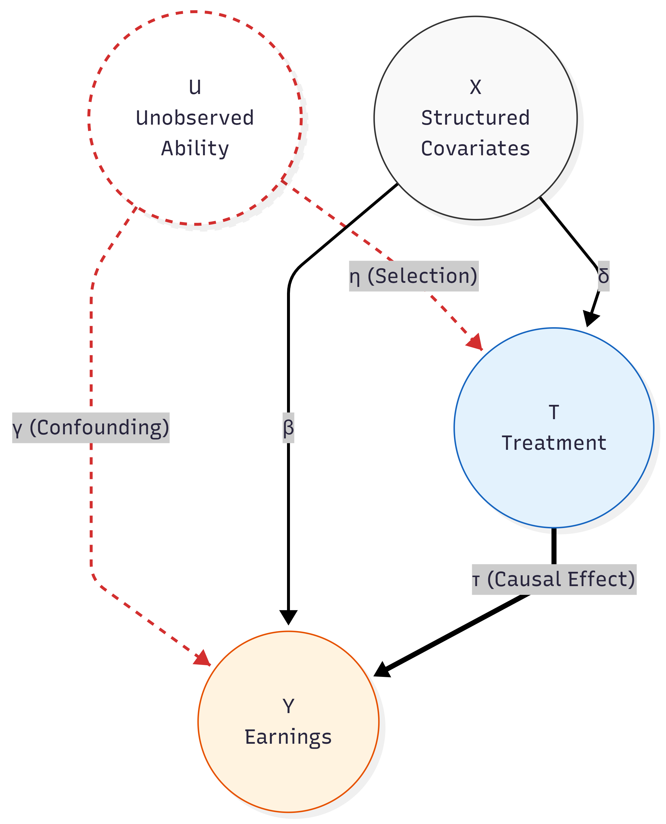 구조적 인과 모델의 DAG 표현. 이 다이어그램은 구조 방정식에서 계수를 인과 그래프로 매핑한다. 굵은 선은 관찰 가능한 공변량 X (δ, β)에 의해 포착된 관계를 나타낸다. 빨간 점선은 능력(U)의 미관찰 영향을 나타내며, 선택 매개 변수 η와 결과 매개 변수 γ에 의해 관리된다. U를 통해 흐르는 열린 뒤쪽 경로는 방정식 (3)에서 유도된 편향 항을 생성한다.
