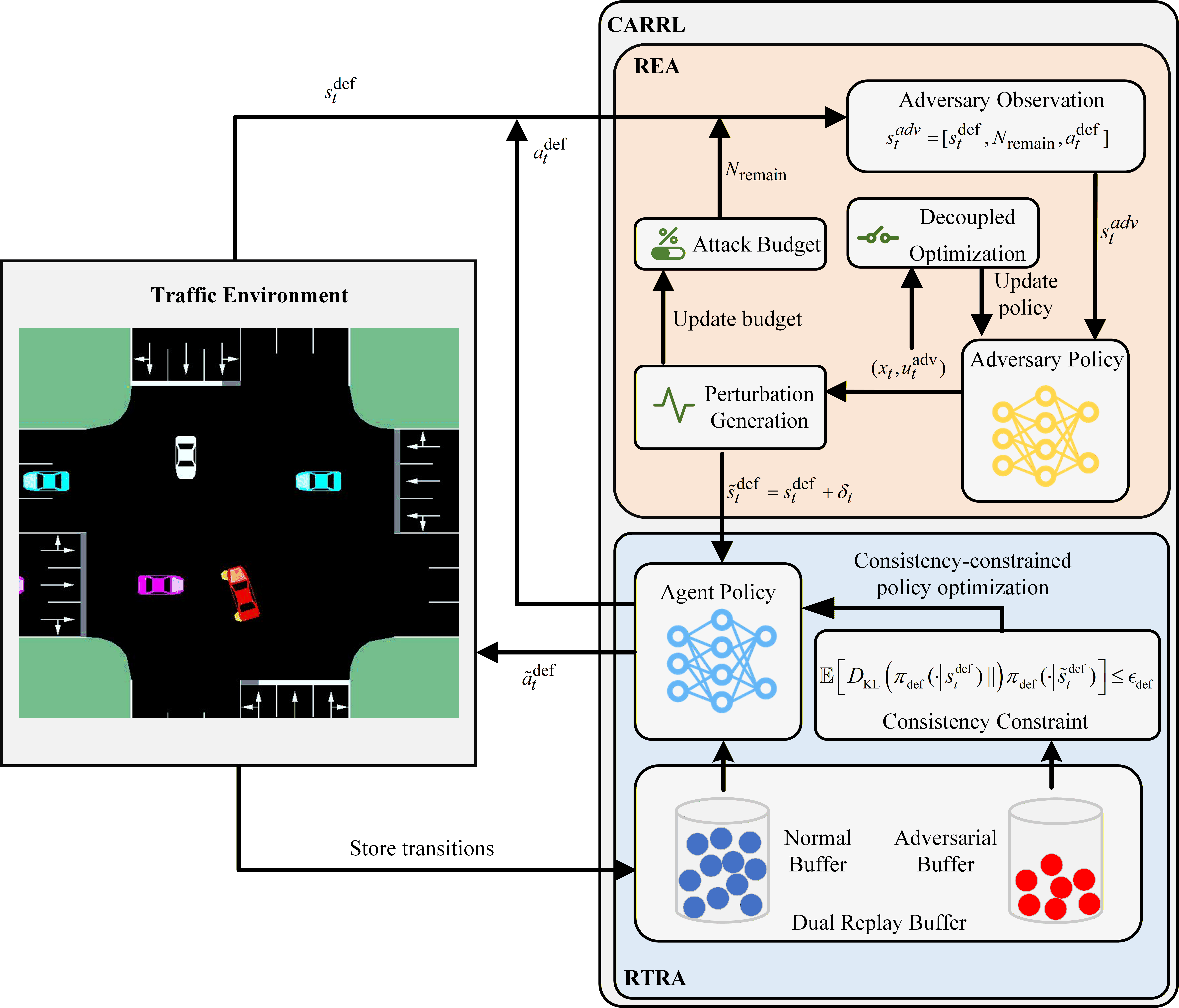 위험 대응 에이전트와 일관성 제약 정책 최적화: REA의 설계로 인한 적대적 데이터 부족을 해결하기 위해 RTRA는 두 가지 핵심 메커니즘으로 장비된다: 이중 재생 버퍼(DRB)와 일관성 제약 정책 최적화(CCPO). DRB은 무해하고 적대적인 경험의 분포를 균형있게 조정하여 데이터 불균형을 완화하며, CCPO는 적대적 편차 하에서 행동의 일관성을 보장한다. 이 공동 설계는 안정적인 정책 수렴과 견고한 운전 성능을 효과적으로 확보한다.