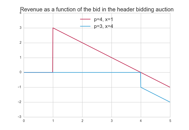 In Figure 2 we plot $`\mathcal{S}_1`$’s revenue as a function of its bid $`q`$, for two sets of values for the closing price $`p`$ of the internal auction and the highest bid $`x`$ among the other SSPs.