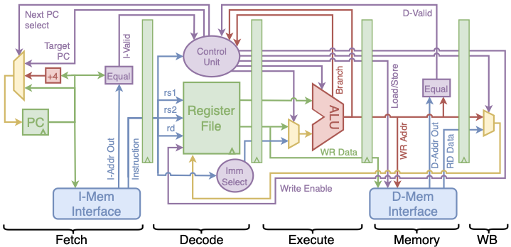 Pipelining allows for a higher clock frequency; however, NOPs are still inserted between synchronous memory operations because there is no pipeline register between the address input and data output of the memory interfaces. Asynchronous memories must still be used to avoid NOPs between instruction fetches. Note, however, that the addition of pipeline stages allows some synthesis tools to implement an asynchronous main memory (without caches) in FPGA BRAM. The five-stage pipelined processor has two variants. The first uses only pipeline stalls and flushes when a pipeline hazard is detected. The second implements data forwarding to avoid stalls for most hazards. Stalling and forwarding logic is wrapped around the base control unit used in the single cycle core. A multiplexer is wrapped around the decode logic to output forwarded data when needed. Wrapping the base modules to build the five stage pipeline maximizes IP reuse and allows for user base module customizations to be carried through their core design space.