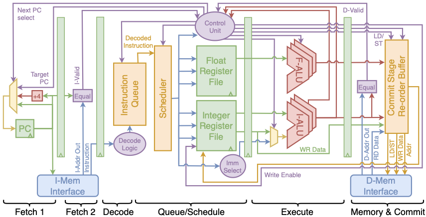 Memory operations wait in the commit module until the memory access has completed. Instructions in the commit module are buffered and sent to the writeback unit in order. Instructions are re-ordered based on the priorities used in the instruction queue. An instructionās ārdā value is stored in a table in the instruction queue stage. Hazards are detected by comparing the ārdā values of in-flight instructions to the ārs1ā and ārs2ā values of instructions entering the queue. An instructionās ārdā value is cleared from the table in the instruction queue stage after the instruction exits the writeback stage, completing its execution.