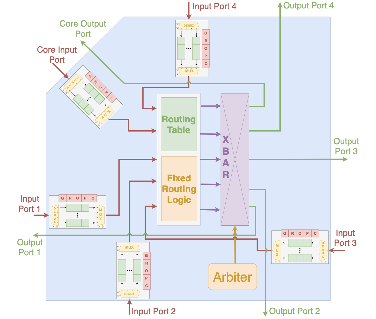 Routers in the NoC can be configured as buffered or buffer-less routers. The routers support oblivious routing algorithms using fixed logic or configurable routing tables. Fixed logic is implemented for Dimension Order Routing. Programmable routing tables enable different routing algorithms with changes to the routing table entries. A wide range of network topologies can be be implemented by configuring the number of input ports, output ports and routing table contents of the routers. Routers included in the platform are conventional virtual channel routers. There are single cycle and pipelined variants of the routers. Users can configure different parameters such as number of input/output ports, virtual channels per port, virtual channel depth to tune the performance and resource usage of the on-chip network opening a rich design space for exploration. The on-chip network is based on the NoC included with the Heracles system .