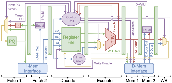 The seven-stage pipelined processor builds on the base modules in the single cycle processor and the pipeline related modules introduced with the five stage processor. It adds registers between the address inputs and data outputs of the memory interfaces to avoid inserting NOPs while waiting for synchronous memory operations. With these extra pipeline stages, BRAM reads and cache hits no longer need to insert NOPs. The additional pipeline stages can be seen in the seven stage pipeline block diagram shown in FigureĀ 7.