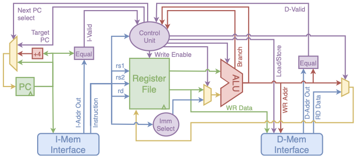 The single cycle processor implements the RV32I instruction set with modules designed around the ātextbookā fetch, decode, execute, memory, and write-back stages of a processor . This processor serves as the base for other cores; as such, it has been designed to be as simple as possible. The modules in the single cycle processor are reused or wrapped with additional logic to support features such as pipelining and data forwarding. A block diagram of the processor is shown in FigureĀ 5. The single cycle processor has instruction and data memory interfaces compatible with every cache and memory subsystem provided in the platform. Due to the single cycle operation, NOPs are inserted between BRAM or off-chip memory accesses. An asynchronous memory is provided to avoid NOPs, but it cannot be implemented in FPGA BRAM and must be kept small to prevent the memory from using too many device resources.