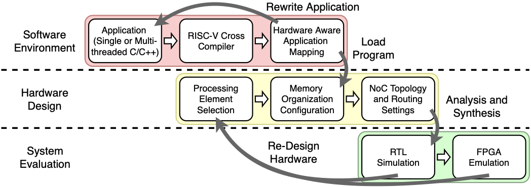 A typical workflow in the platform (shown in FigureĀ 4) starts with developing the software application to be run on the hardware system. Software is compiled with either the GNU or LLVM compiler toolchain for RISC-V. The included compiler scripts support simple multi-processing and multi-threading environments.