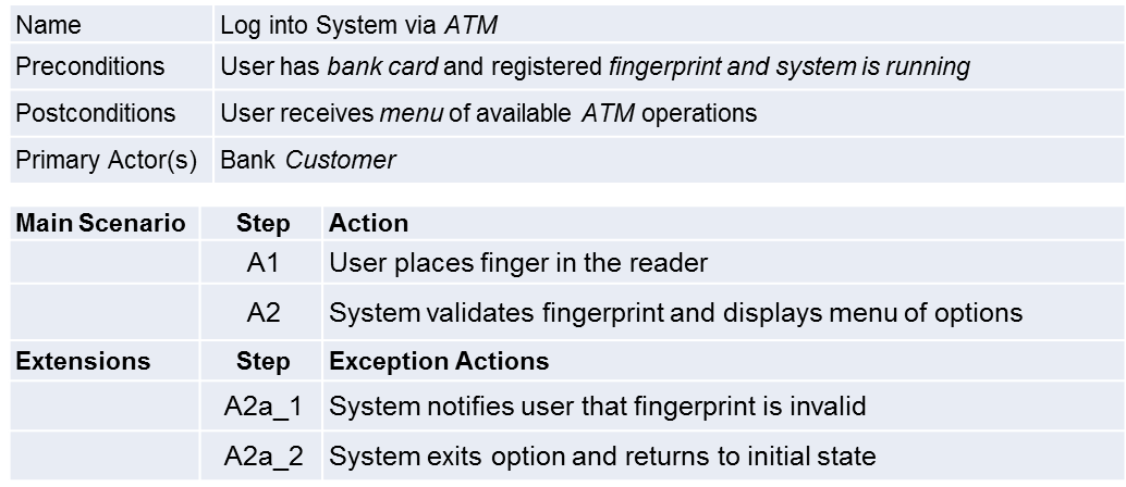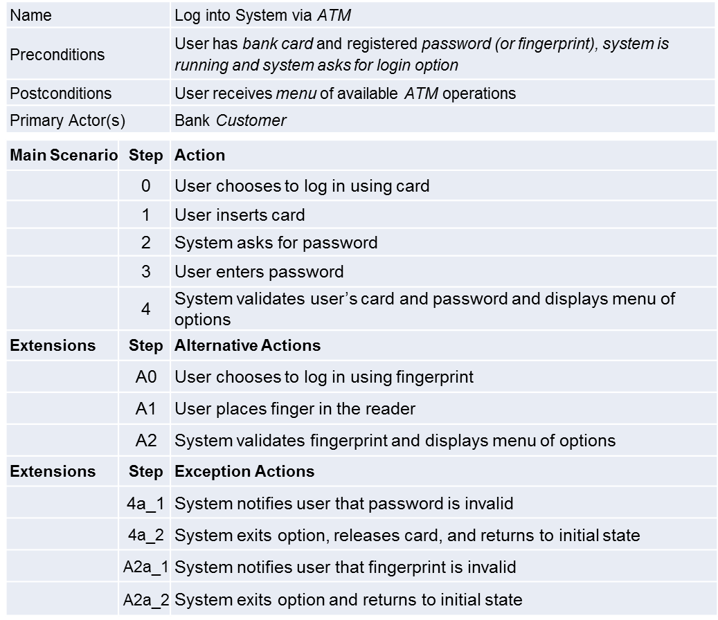 The CPA graph of the resulting GT is shown in Figure 11 (we included InsertCard here to show how it would appear, if it had not been explicitly deleted by the evolution step). Rules InsertCard and ChooseId-card should be removed from the set of resulting step rules because they have no effect (they do not delete/create anything, and are thus disconnected in the CPA graph). Rule ChooseId-fprt is not in conflict with itself and thus can occur indefinitely many times: since this choice is actually no longer needed, it may be removed. The starting point of the corresponding UC should be InsertFingerprint. Rules AskPwd, InsertPwd, ValidateCard, InvalidCard and Exit are not reachable from InsertFingerprint. Since these actions are not to be performed in parallel with others (if this would be the case, being independent from InsertFingerprint would be correct), all these rules should also be removed. The resulting UC is shown in Figure 12.
