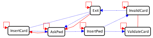 Figure 13 shows the conflicts and dependencies between rules from Figure [fig:gg-from-uc]. It is possible to see that all rules are in conflict with themselves. This represents the fact that, after a match is found and the rule is applied, it cannot be applied again in the same part of the graph. In a UC, this means that each step of the UC is supposed to be performed only once. Rules ValidateCard and InvalidCard are related by an undirected conflict line: they are in dd conflict. In this case, this is an expected conflict, as these rules represent a decision point of the UC. Rule InsertCard is in ff conflict with itself, which is also expected as one should not insert a card after it has already been inserted. This graph was automatically generated from the rules by the AGG tool, which can also inform which type of conflict/dependency each arrow represents and show the elements that caused the conflict/dependency.