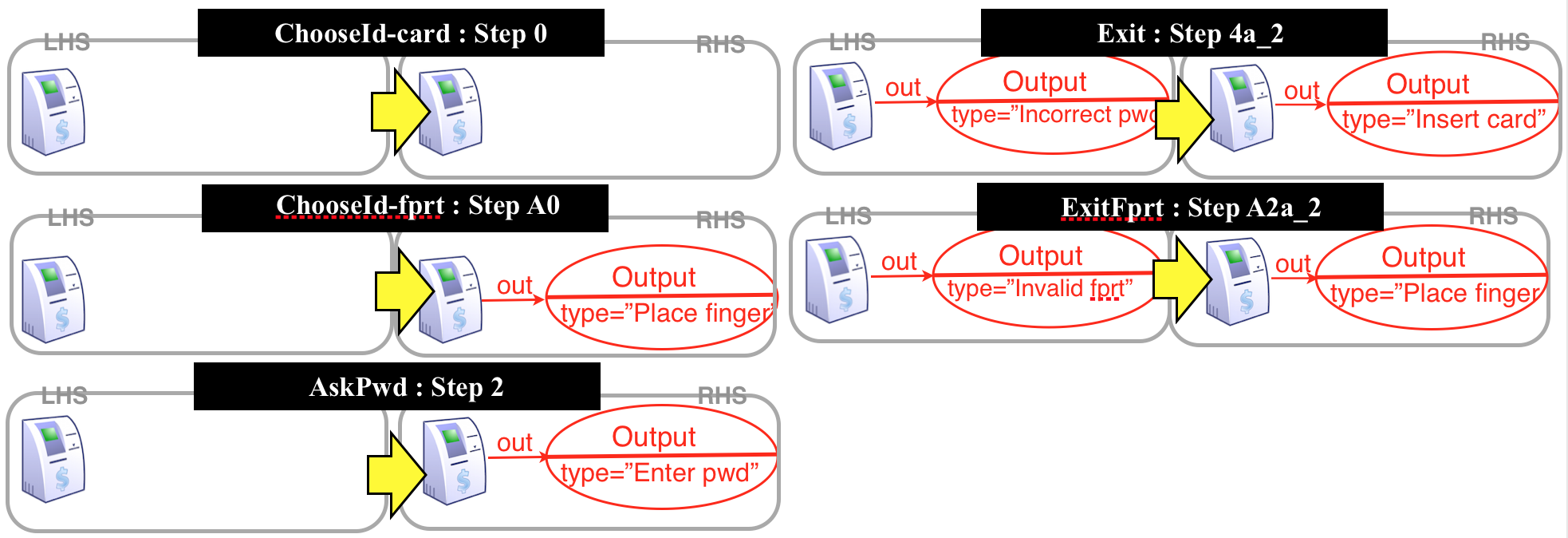 Many step rules in the grammar of Figure 4 will be affected by evolution 2 (removal of card and password authentication). Due to space limitations, it is not possible to show all cases, but only examples of situations that arise from this evolution: