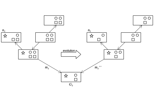 Figure 2 depicts an example of evolution of a rule with NACs. The intermediate rule of the evolution is isomorphic to the right-hand side rule and it is omitted from the diagram. The original rule deletes a star in the presence of two circles and two squares. Its only NAC $`n_2 : L \to N_2`$ forbids the application whenever the preserved circles are identified. Notice that $`m_3 : L \to G_3`$ is not disabled by $`n_2`$, since there is only one square, and therefore there is no injective morphism $`e : N_2 \rightarrowtail G_3`$. The evolution consists in removing one of the preserved squares from the rule, generating a rule that deletes a star in the presence of two circles and one square. The NAC evolution generates a single NAC $`n_2'' : L'' \to N_2''`$, without the deleted square. Notice, however, that what prevented NAC $`n_2`$ from disabling $`m_3`$ was the impossibility of identifying the squares in a monomorphism. Since now there is only one square, there is actually a possible monomorphism $`e'' : N_2'' \rightarrowtail G_3`$ for $`n_2''`$, and therefore $`n_2''`$ disables the match $`m_3''`$, which is related to $`m_3`$ by the evolution.