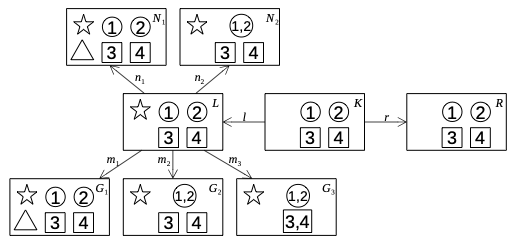 These effects can be observed in the Figure 1, which shows a rule $`L \gets K \to R`$ with set of NACs $`\{n_1,n_2\}`$ together with three graphs $`G_1`$, $`G_2`$ and $`G_3`$, together with one match for each graph: $`m_1 : L\to G`$, $`m_2 : L \to G_2`$, and $`m_3 : L \to G_3`$. The mappings are provided by the numbers within nodes. Match $`m_1`$ is disabled by NAC $`n_1`$ due to the presence of a star in $`G_1`$. Match $`m_2`$ is disabled by NAC $`n_2`$ due to the identification of the circles. Match $`m_3`$ is not disabled by $`n_2`$ because $`n_2`$ does not identify the squares, even considering that $`m_3`$ identifies the circles as specified by $`n_2`$.