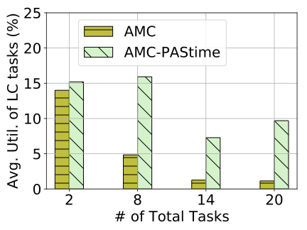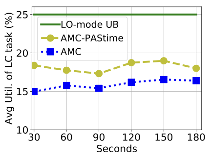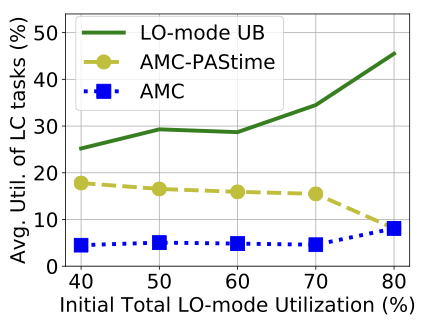 FigureĀ [fig:util_amc_avg_lc_util] demonstrates that AMC- improves average utilization of the low-criticality tasks by more than 3 times, up to 70% total LO-mode utilization. After that, AMC- and AMC scheduling converge to the same average utilization for low-criticality tasks. This is because there is insufficient surplus CPU time in LO-mode for AMC- to accommodate the extended budget of a high-criticality task. Therefore, the LO-mode extension requests are disapproved by AMC-. The reduced number of mode switches for AMC-, shown in TableĀ 6, also corroborates the rationale behind AMC-ās better performance than AMC.