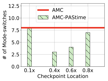 We see that the number of mode switches decreases if the location of a checkpoint is more towards the middle of the code. However, a checkpoint near the start and the end of the source code have nearly the same number of mode switches, as with AMC scheduling. A checkpoint near the beginning of a program is not able to capture sufficient delay to increase the LO-mode budget enough to prevent a mode switch. Likewise, a checkpoint near the end of a program is often too late. A HI-mode switch may occur before the high-criticality task even reaches its checkpoint. Hence, a checkpoint at $`0.8\times`$ in the source code of a program reduces the number of mode switches by just 1.