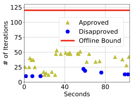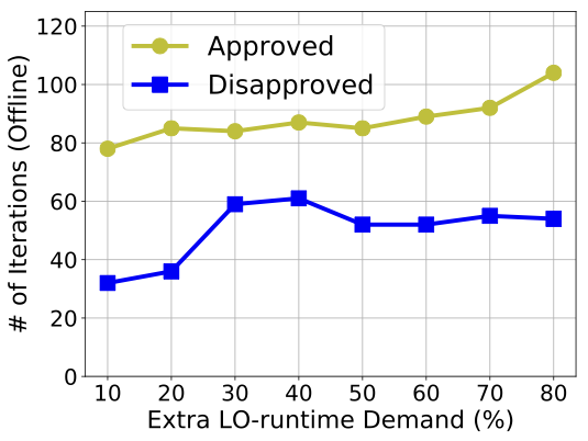 FigureĀ [fig:iterations] shows the number of iterations for the online schedulability test for a taskset of 20 tasks with 60% initial total LO-mode utilization, in cases where an extension was approved and disapproved. We see that the offline bound of 120 iterations is much higher than the actually observed number of iterations. Hence, we never need to abandon the schedulability test because of excessive overheads. In addition, disapproval takes less time than approval online, which corroborates our offline observations in FigureĀ [fig:offline_iterations].