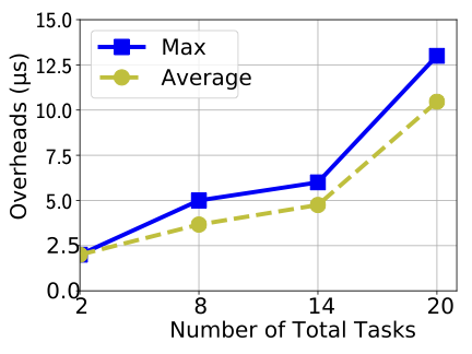 FigureĀ 8 shows the maximum and average times for a LO-mode budget extension decision including the online schedulability test. It demonstrates that the extension approval decision takes more time with increasing number of tasks. However, the maximum times are still significantly lower than the offline upper bound of 130$`\mu`$s for 20 tasks. In general, budget extension overheads can be bounded according to the number of tasks in the system.