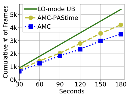 We see in FigureĀ 2 that AMC- has a 9ā21% increase in the cumulative number of decoded frames compared to AMC scheduling. The performance of the low-criticality task is related to the number of HI-mode switches in the two scheduling policies. AMC- decreases the number of HI-mode switches by 35%, compared to AMC scheduling.