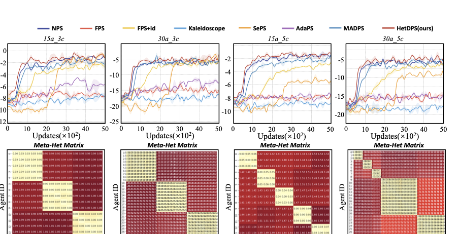 Baselines and training. We compare HetDPS with other parameter sharing baselines, as listed in TableĀ [tab:methods_comparison]. As seen from the table, current methods can not effectively utilize heterogeneity. Although some methods implicitly use certain heterogeneity quantification results, the elements they involve are not comprehensive. MADPS, as the only method that explicitly uses policy distance for dynamic grouping, relies on the assumption that policy learning can effectively capture heterogeneity, which lacks practicality. All parameter-sharing methods are integrated with MAPPO, and we use official implementations of the baselines wherever available. For more details of the experiments, see the Appendix K.