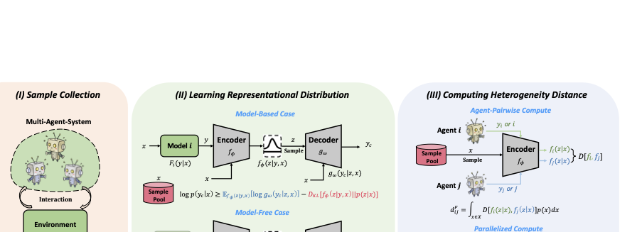 ā¢Ā Quantifying Heterogeneity: We define the heterogeneity distance, and propose a quantification method based on representation learning, applicable to both model-free and model-based settings. Additionally, we give the concept of meta-transition heterogeneity to quantify agentsā comprehensive heterogeneity.