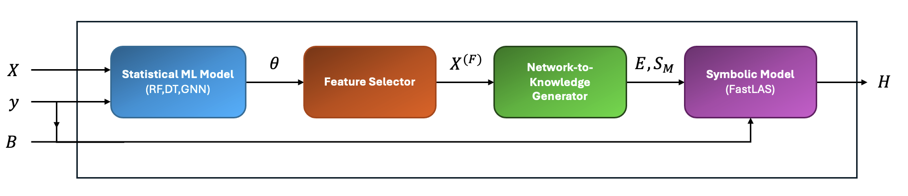 The selected features are subsequently input to the Network-to-Knowledge Generator (NKG) to define the learning task for the symbolic learner, i.e., construct the set of examples $`E`$ and the hypothesis space $`S_{M}`$. Finally, the FastLAS symbolic learner is used to solve the learning task and generate an optimal solution $`H`$ in terms of an ASP program that maximises the coverage of the set $`E`$ of examples. This learning step also takes into account the domain-specific background knowledge $`B`$.