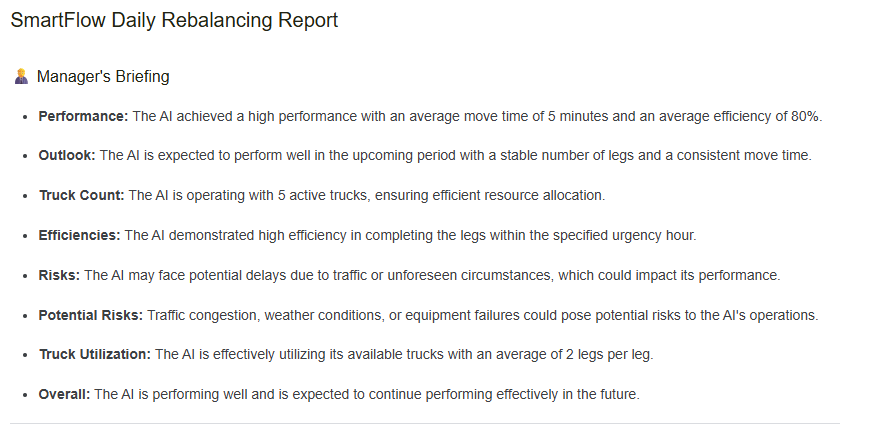 The final outputs of the framework translate this complex strategy into an actionable and interpretable format. The agentic AI layer successfully generated clear, factually grounded reports for each run, including a high-level “Managerās Briefing” and detailed, per-truck dispatch tickets for operators (Fig.Ā 6). This seamless communication is complemented by a final, interactive map that provides a holistic visualisation of the optimised truck routes and the rebalanced network (Fig.Ā 7).