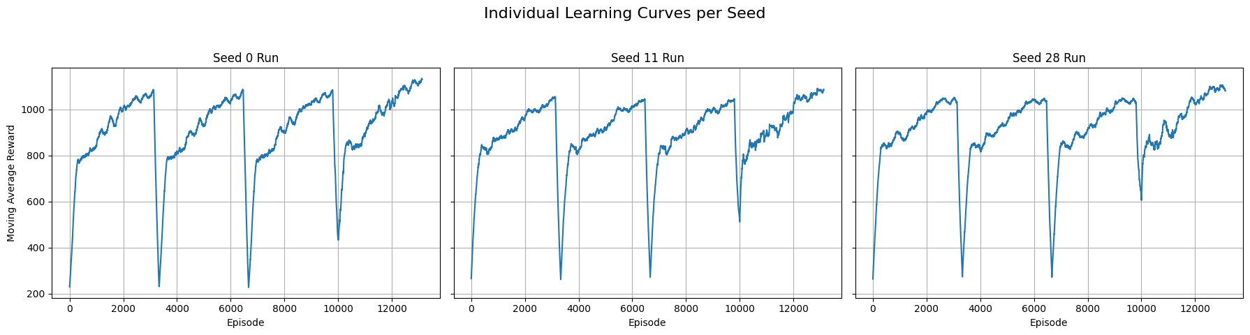 The Deep Q-Network agent was trained for one million timesteps in each of the three runs. The agentās learning progress and stability are visualised by first examining the reward curves from each independent run (Fig.Ā 2). While each run exhibits the natural variance and cyclical dips characteristic of reinforcement learningās exploration process, all three show a clear and positive learning trajectory.