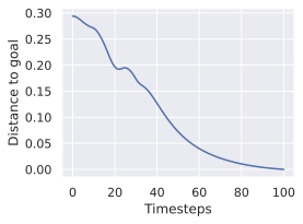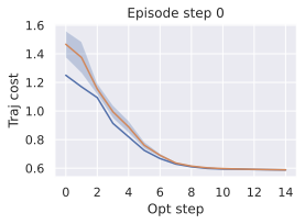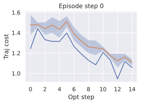 (ii) Sampling-based methods: On 2D navigation tasks, CEM clearly outperforms NG, as these tasks require precise action sequences where CEMās faster convergence to tight action distributions is beneficial, while NGās slower, more exploratory optimization is detrimental. To compare both methods, we plot the convergence of the optimization procedure at each planning step in 16, and observe that NG converges more slowly, indicating more exploration in the space of action trajectories. On DROID and Robocasa, CEM and NG perform similarly. When using NG, we have fewer planning hyperparameters than with CEM, which requires specifying the top-$`K`$ trajectories parameter and the initialization of the proposal Gaussian distribution $`\mu^0, \sigma^0`$āparameters that heavily impact performance. Crucially, on real-world manipulation data (DROID and Robocasa), NG performs on par with CEM while requiring no hyperparameter tuning, making it a practical alternative when transitioning to new tasks or datasets where CEM tuning would be costly.
