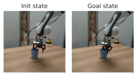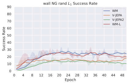 We sample the goal frame from an expert policy provided with Metaworld, from the dataset for Push-T, DROID and Robocasa, and from a random 2D state sampler for Wall and Maze, more details in 9. For the models with proprioception, we plan using proprioceptive embedding distance, by setting $`\alpha=0.1`$ in equationĀ [eq:plan_objective], except for DROID and Robocasa, where we set $`\alpha=0`$, to be comparable to V-JEPA-2-AC.