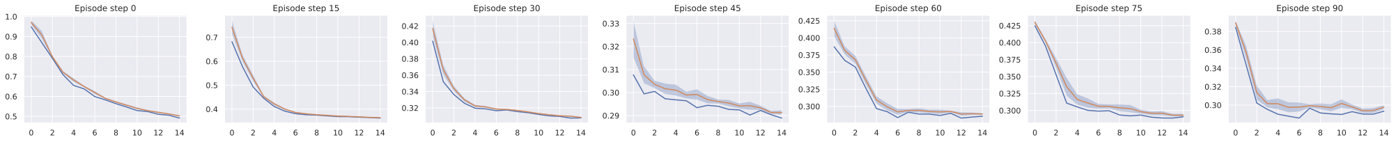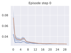 Throughout training, every 300 training iterations, we unroll the predictor on a batch of the validation split for $`n`$ steps. For each of these steps, we compute the $`L_1`$ and $`L_2`$ loss between the predicted embedding and the embedding of the ground truth corresponding future frame. The $`L_2`$ loss at step 1 is the teacher-forcing loss term $`\mathcal{L}`$.