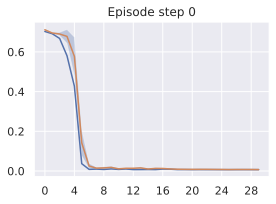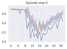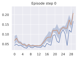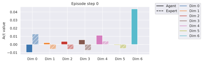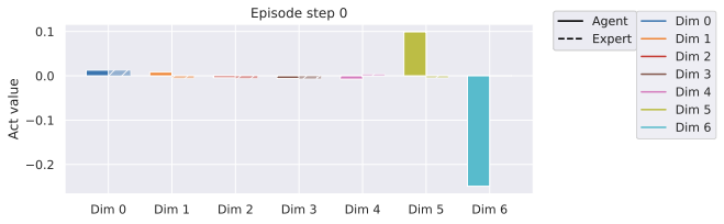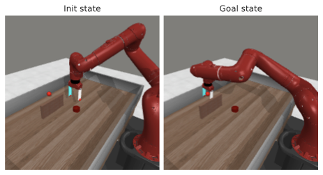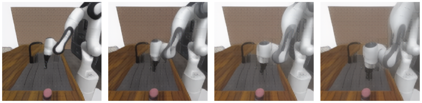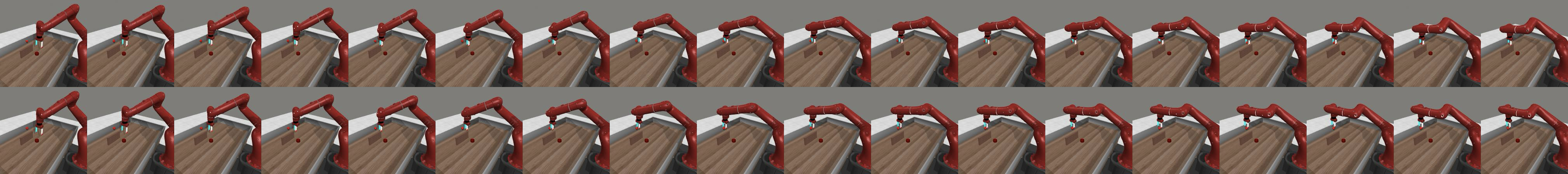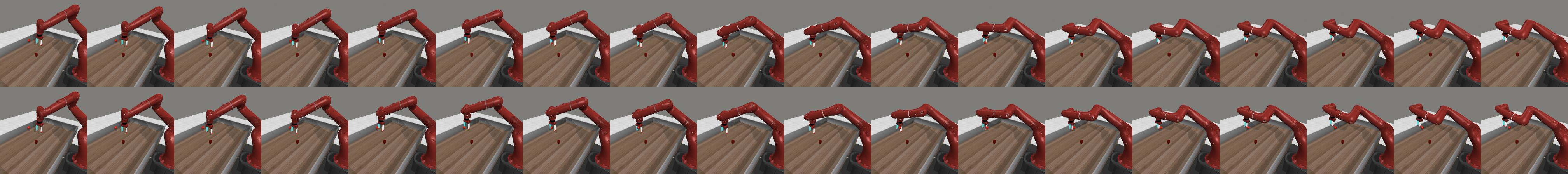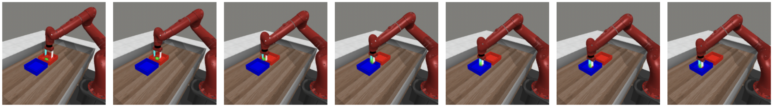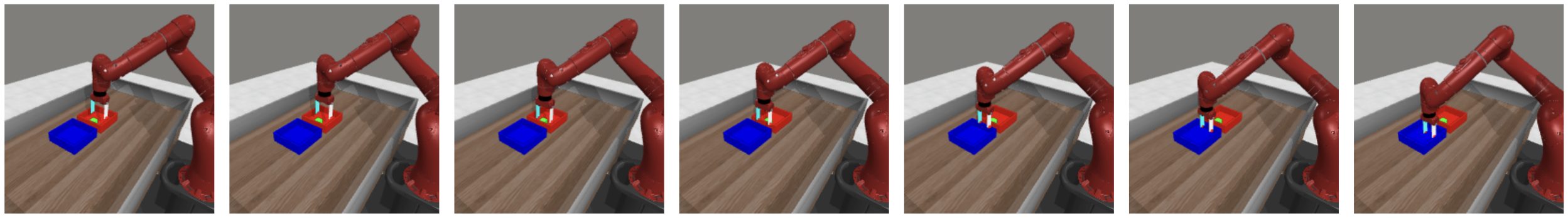 Our agent solves the pose control tasks like reach and reach-wall. In addition, long-term action unrolling with object interaction seems to be well-captured by our models, as shown in 22 for the bin-picking task. Yet, for tasks involving object manipulation, it hallucinates grasping the object. In 23, the visual decoding of the unrolling of the action plan shows a gap between the imagined consequences of the actions and their consequences in the simulator. This calls for a separate optimization procedure for the action dimension that corresponds to the end-effectorās gripper.
