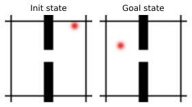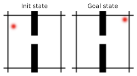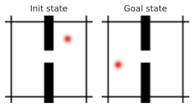 Let us detail the failure cases of the GD planner. On the Wall task, the GD planner gets zero performance, although the task is visually simplistic. We identify two main failure cases. Either the agent goes into the wall without being able to pass the door, which is a classical failure case for better CEM or NG planners. Or the agent finds a local planning cost minimum by going to the borders of the image, when starting close to them. We illustrate both of these in 17.