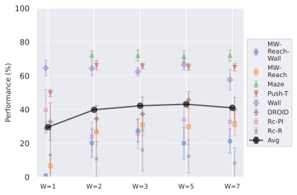 We aim to test whether allowing the predictor to see a longer context at train time allows to better unroll longer sequences of actions. We test values from $`W=1`$ to $`W=7`$.