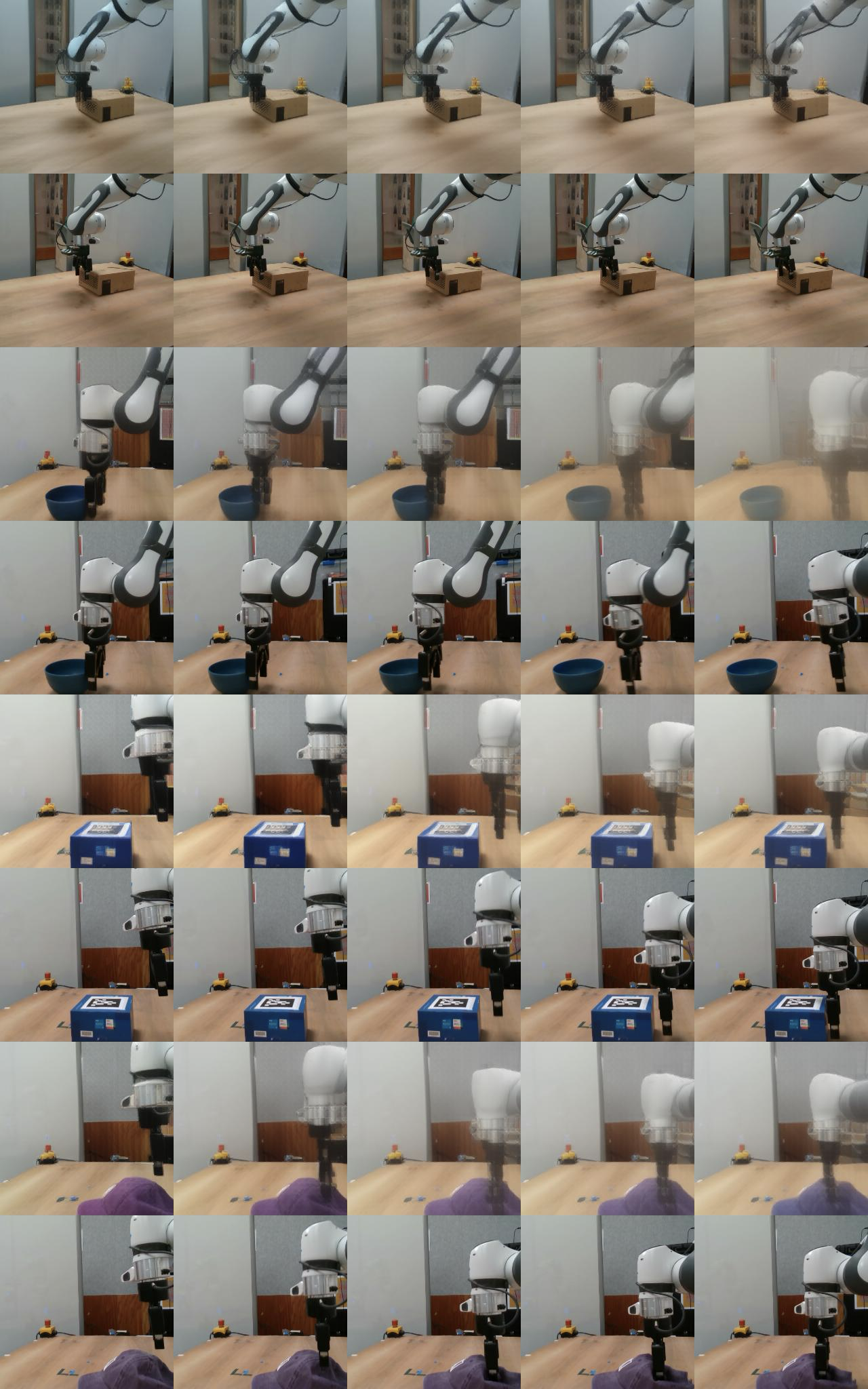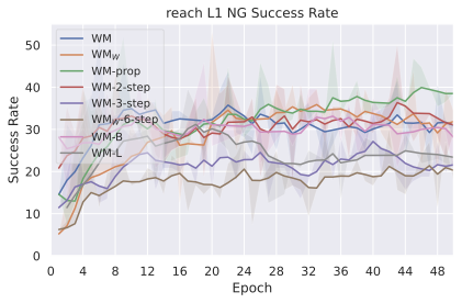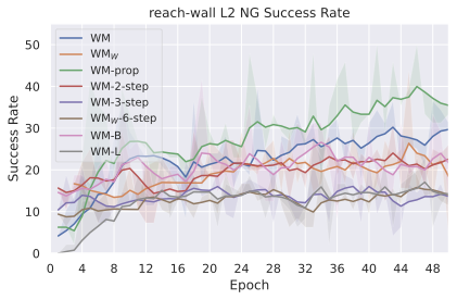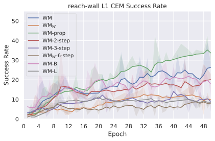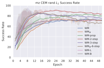 Training on longer context takes more iterations to converge in terms of success rate. We recall that we chose to plan with $`W^p=2`$ in all our experiments, since it yields the maximal success rate while being more computationally efficient. The predictor needs two frames of context to infer velocity and use it for the prediction task. It requires 3 frames to infer acceleration. We indeed see in 10 a big performance gap between models trained with $`W=1`$ and $`W=2`$, which indicates that the predictor benefits from using this context to perform its prediction. On the other hand, with a fixed training computational budget, increasing $`W`$ means we slice the dataset into a fewer but longer unique trajectory slices of length $`W+1`$, thus less gradient steps. On DROID, having too low $`W`$ leads to discarding some videos of the dataset that are of length lower than $`W+1`$. Yet, we observe that models trained on DROID have their optimal $`W`$ at 5, higher than on simulated datasets, for which it is 3. It is likely due to the more complex dynamics of DROID, requiring longer context to notably infer real-world arm and object dynamics. One simple experiment shows a very well-known but fundamental property: the training maximum context $`W`$ and planning maximum context $`W^p`$ must be chosen so that $`W^p \leq W`$. Otherwise, we ask the model to perform a prediction task it has not seen at train time, and we see the predictions degrading rapidly throughout unrolling if $`W^p > W`$. To account for this, the $`W=1`$ model performance displayed in 10 is from planning with $`W^p=1`$.