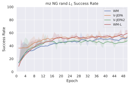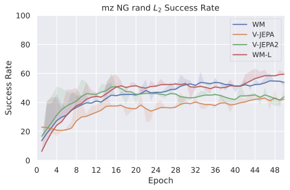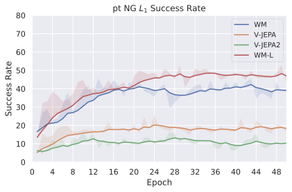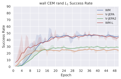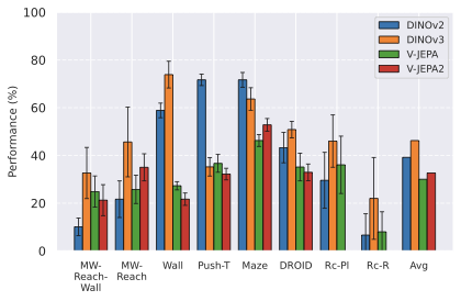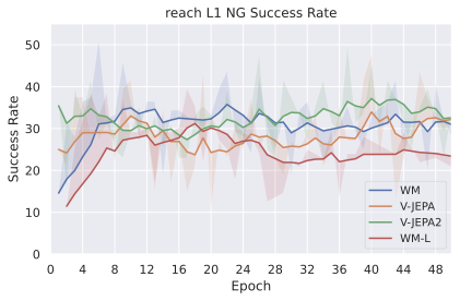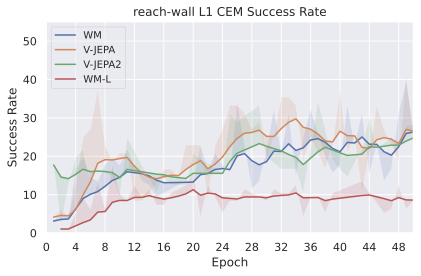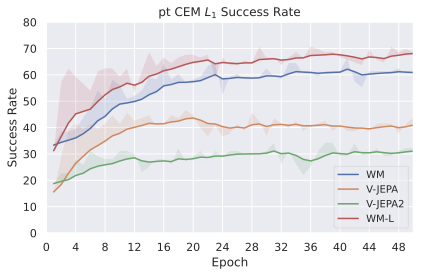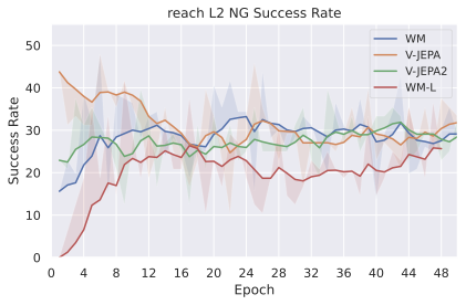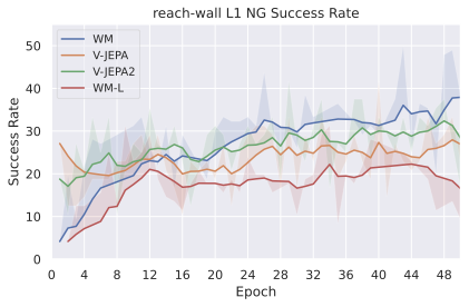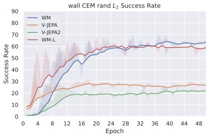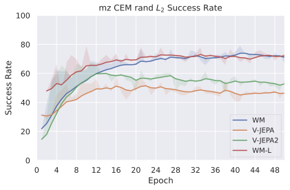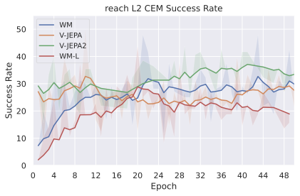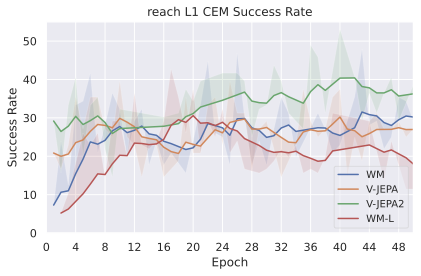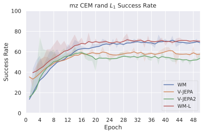 Among these JEPA-WMs, PLDMĀ shows that world models learned in a latent space, trained as JEPAs, offer stronger generalization than other Goal-Conditioned Reinforcement Learning (GCRL) methods, especially on suboptimal training trajectories. DINO-WMĀ shows that, in absence of reward, when comparing latent world models on goal-conditioned planning tasks, a JEPA model trained on a frozen DINOv2 encoder outperforms DreamerV3Ā and TD-MPC2Ā , when we deprive these of reward annotation. DINO-WorldĀ shows the capabilities in dense prediction and intuitive physics of a JEPA-WM trained on top of DINOv2 are superior to COSMOS. The V-JEPA-2-ACĀ model is able to beat Vision Language Action (VLA) baselines like OctoĀ in greedy planning for object manipulation using image subgoals.