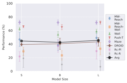We show in [subfig:model_size_comparison,subfig:pred_depth_comparison] that increasing encoder size (with predictor width) or predictor depth does not improve performance on simulated environments. However, on DROID, we observe a clear positive correlation between both encoder size and predictor depth with planning performance. This indicates that real-world dynamics benefit from higher-capacity models, while simulated environments saturate at lower capacities. Notably, the optimal predictor depth appears to be 6 for most simulated environments, and possibly as low as 3 for the simplest 2D navigation tasks (Wall, Maze). Moreover, larger models may actually be detrimental on simple datasets: at planning time, although we optimize over the same action space, the planning procedure explores the visual embedding space, and larger embedding spaces make it harder for the planning optimization to distinguish nearby states (see 30).