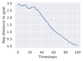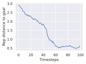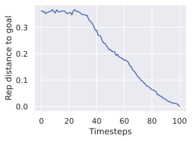 We see in 30 that the relative difference in embedding space distance to the goal is approximately ten times smaller in the ViT-L model than in the ViT-S model. This is consistent with the fact that the ViT-L model has a higher capacity and can therefore embed more information in its latent space, in which two states of Metaworld are closer to each other than in the ViT-S model embedding space.