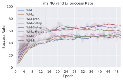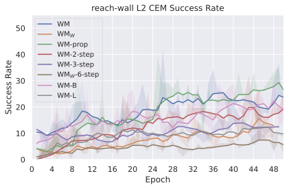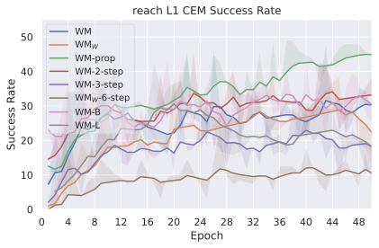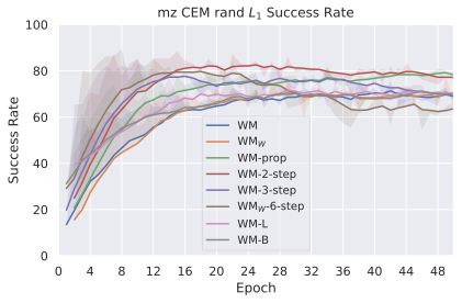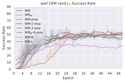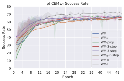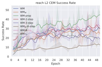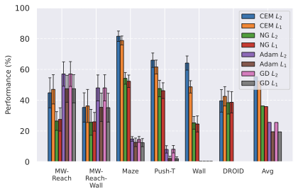 We compare four planning optimizers: Cross-Entropy Method (CEM), Nevergrad (NG), Adam, and Gradient Descent (GD). CEM is a variant of the CMA-ES familyĀ with diagonal covariance and simplified update rules. NG uses the NGOpt wizard, which selects diagonal CMA-ESĀ based on optimization space parametrization and budget, see [algo:NG]. We observe in 3 that the CEM $`L_2`$ planner performs best overall.