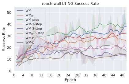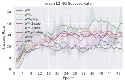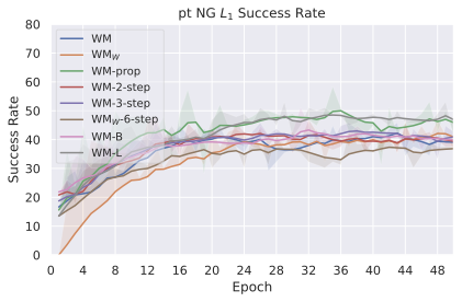 The results in 33 clearly show that CEM performs better than NG for the Push-T task. The Push-T task requires very precise actions, since if the ball is slightly off the position where it should be to push the T-shape, it misses the shape and fails at the task. Hence it proves essential to only step actions after convergence of the planner. Yet, we see in 24 that the NG planner is more explorative and should therefore be parametrized differently for this type of task. Interestingly, the larger model converges faster and brings higher maximal success rate on this task.