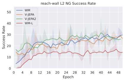 In 7, we see a clear advantage of DINO encoders compared to V-JEPA encoders. We posit this is due to the well-known fact that DINO has better fine-grained object segmentation capabilities, which is crucial in tasks requiring a precise perception of the location of the agent and objects. Interestingly, DINOv3 clearly outperforms DINOv2 only the more photorealistic environments, Robocasa and DROID, likely due to the pretraining dataset of DINOv3 being more adapted to such images. On Maze and Wall, models trained on DINOv3 take longer to converge to a lower success rate.
