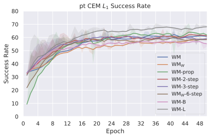 In [tab:all_planners_model_comp], we compare the performance of our model to the DINO-WM and VJEPA-2-AC baselines across all planner configurations tested in 5. Our optimal JEPA-WM consistently outperforms the baselines on most tasks and planners, as in [tab:final_model_comp_baselines].