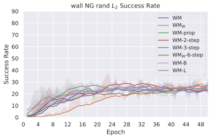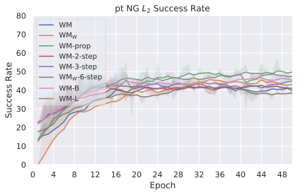 We display in 32 and 33 the evolution of success rate over training epochs for some of the models that compose the design choice study of this paper.