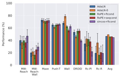 In 9, we observe that, while AdaLN with RoPE achieves the best average performance across environments, the advantage is slight, and results are task-dependent: on Metaworld, sincos+ftcond actually performs best. We do not see a substantial improvement when using RoPE instead of sincos positional embedding. A possible explanation for AdaLNās effectiveness is that this conditioning intervenes at each block of the transformer predictor, potentially avoiding the vanishing of the action information throughout the layers. It is also more compute-efficient than other conditioning methods, as explained by . We also study AdaLN-zero, following ās naming. Although find AdaLN-zero to outperform AdaLN in their setup, we observe that, despite a higher average performance, AdaLN-zero underperforms AdaLN on the environments that provide the most reliable signal (DROID, PushT, Maze), which are less prone to noise in success rate and yield more consistent results across our other design choice experiments. Hence, we will consider, for our final JEPA-WMs optimum, the AdaLN variant. One important consideration when scaling predictor embedding dimension is maintaining the ratio of action to visual dimensions, which requires increasing the action embedding dimension in the feature conditioning case. To isolate the effect of the conditioning scheme from capacity differences due to different action ratios, we conduct additional experiments with equalized action ratios (see 11.1), which reveal task-dependent preferences between conditioning schemes that cannot be attributed to action ratio alone.