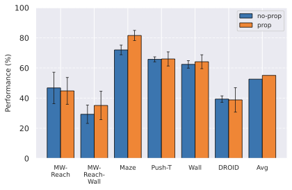 We observe in 6 that models trained with proprioceptive input are consistently better than without. On Metaworld, most of the failed episodes are due to the arm reaching the goal position quickly, then oscillating around the goal position. Thus, having more precise information on its exact distance to the goal increases performance. On 2D navigation tasks, the proprioceptive input also allows the agent to propose a more precise plan. We do not display the results on Robocasa as the proprioceptive space is not aligned between DROID and Robocasa, making models using proprioception irrelevant for zero-shot transfer.