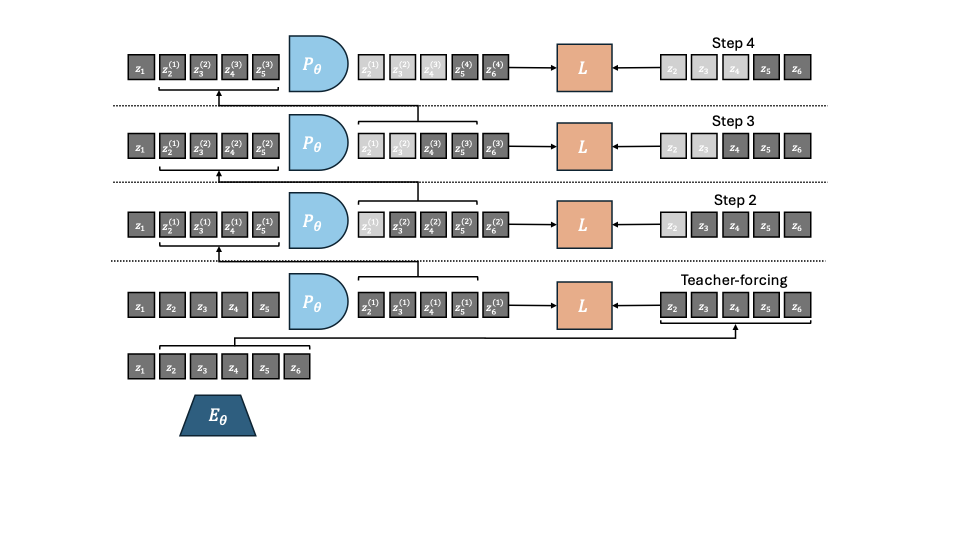 At each training iteration, in addition to the frame-wise teacher forcing loss of equationĀ [eq:frame-teacher-forcing-loss], we compute additional loss terms as the $`k`$-step rollout losses $`\mathcal{L}_k`$, for $`k \geq 1`$, defined as