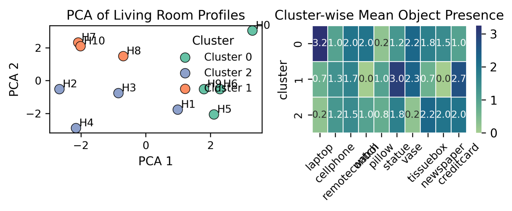 For example, as shown in Fig. 3 (left), households form natural clusters based on their living room object usage, while their corresponding cluster-wise object profile (Fig.Ā 3 (right)) reveals structured differences (e.g., tech-heavy or minimalist usage). The observations in Fig. 3 suggest that, during search, the difficulty does not stem from complex world configuration or dynamics but from the agentās inability to efficiently exploit this well-defined latent structure. By adopting the latent semantic variable $`\phi`$ and constructing an explicit belief structure on $`\phi`$, we can facilitate search task. In the next section, we formalize this idea.