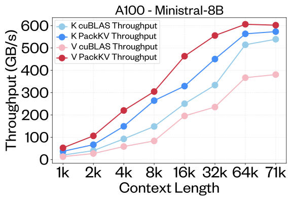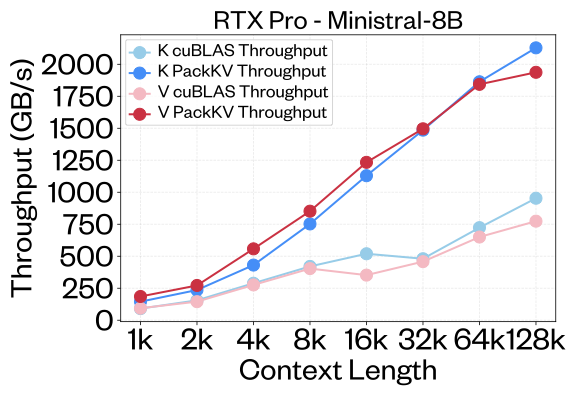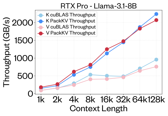 Computation-aware decompression integration: By integrating decompression directly into matrix-vector multiplication kernels, PackKV reduces redundant memory operations and enhances overall throughput.