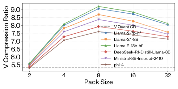 We evaluate different pack sizes, ranging from 2 to 32, with the K and V relative quantization scales set to 0.1 and 0.2, respectively, which are the appropriate quantization scale settings based on our findings in TableĀ [tab:turning_points_k] and TableĀ [tab:turning_points_v].