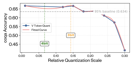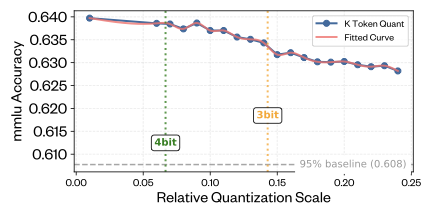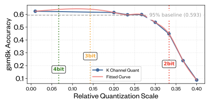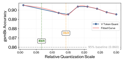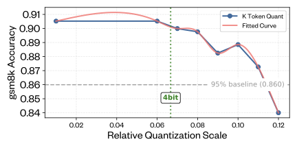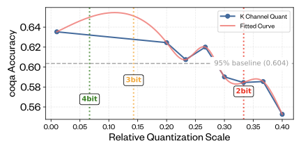 We use an adaptive quantization granularity for the K cache than the state-of-the-art quantization method-KIVI. We compare them at matched accuracy. To determine the comparison point, we measure accuracy across relative quantization scales (yielding scatter plots; examples in FigureĀ 24) and interpolate to obtain a continuous accuracyāscale curve. We define an acceptable accuracy drop of 5% (application-dependent; used here only to equalize accuracy) and select the largest relative scale whose loss is $`\le`$5%. These acceptable accuracy turning points are summarized in TableĀ [tab:turning_points_k].