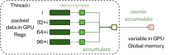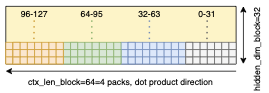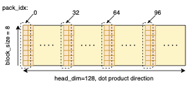 Dot product thread assignment: Matrix-vector multiplication consists of independent dot products. For GPU implementation, a key consideration is thread assignment per dot product. FigureĀ 9 shows our simplified example with block size 8, pack size 8, and one attention head.